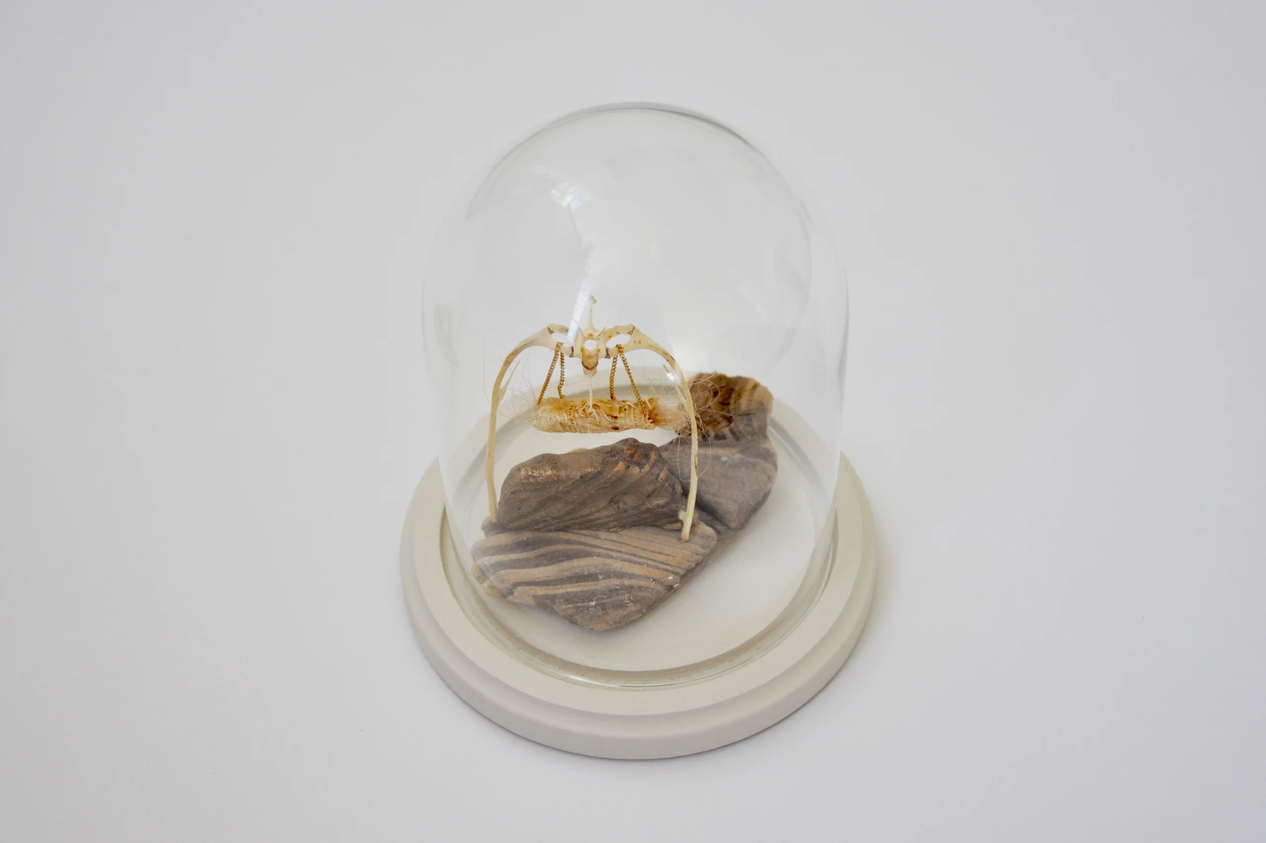 materials: cast bronze driftwood, driftwood, seagull ribs and vertebrae, gold chain, quiet recitations, waxed lace, hair