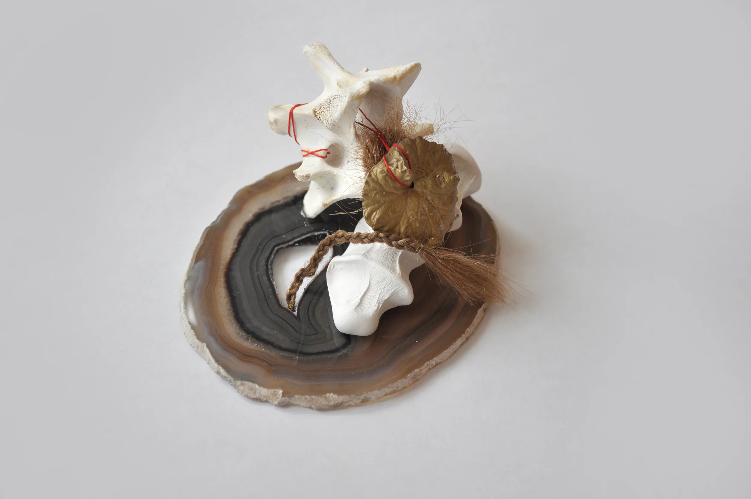 materials: cast bronze pineapple geranium leaf, bone, silk cord, hair, agate