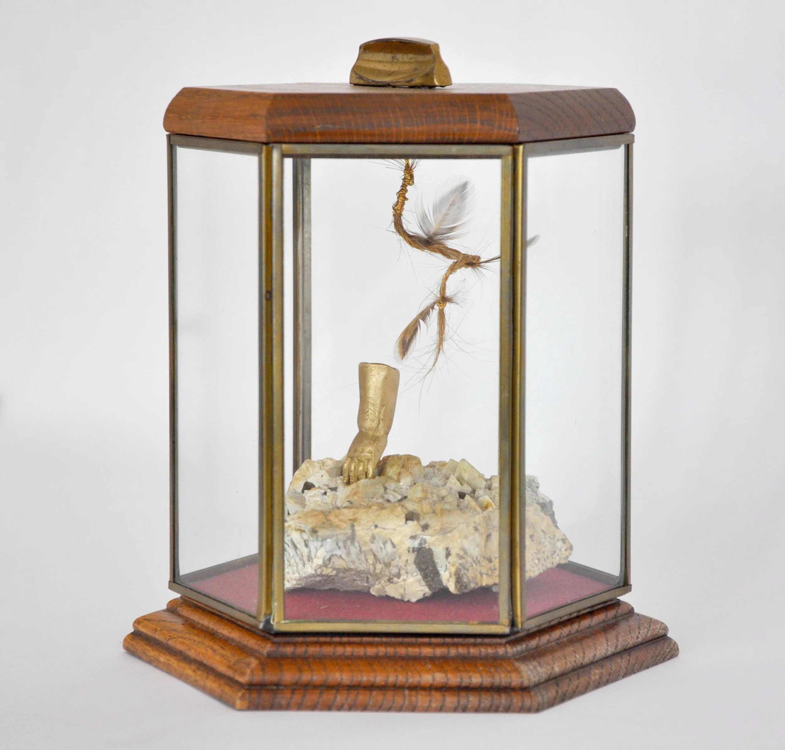 materials: bronze cast baby hand, horsehair, mineral, feathers, wire