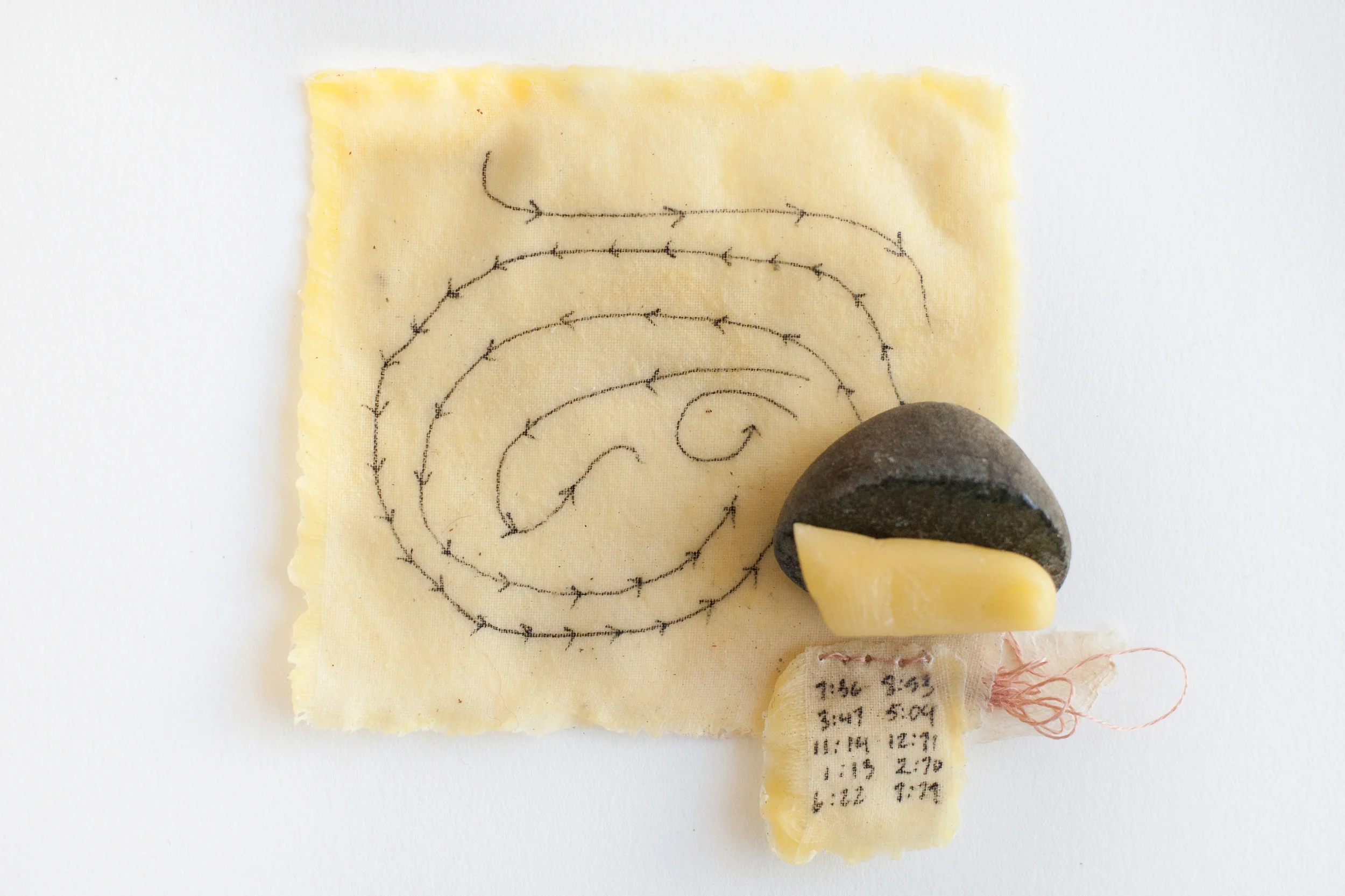 materials: ink, waxed muslin, wax, stone, thread, handmade paper