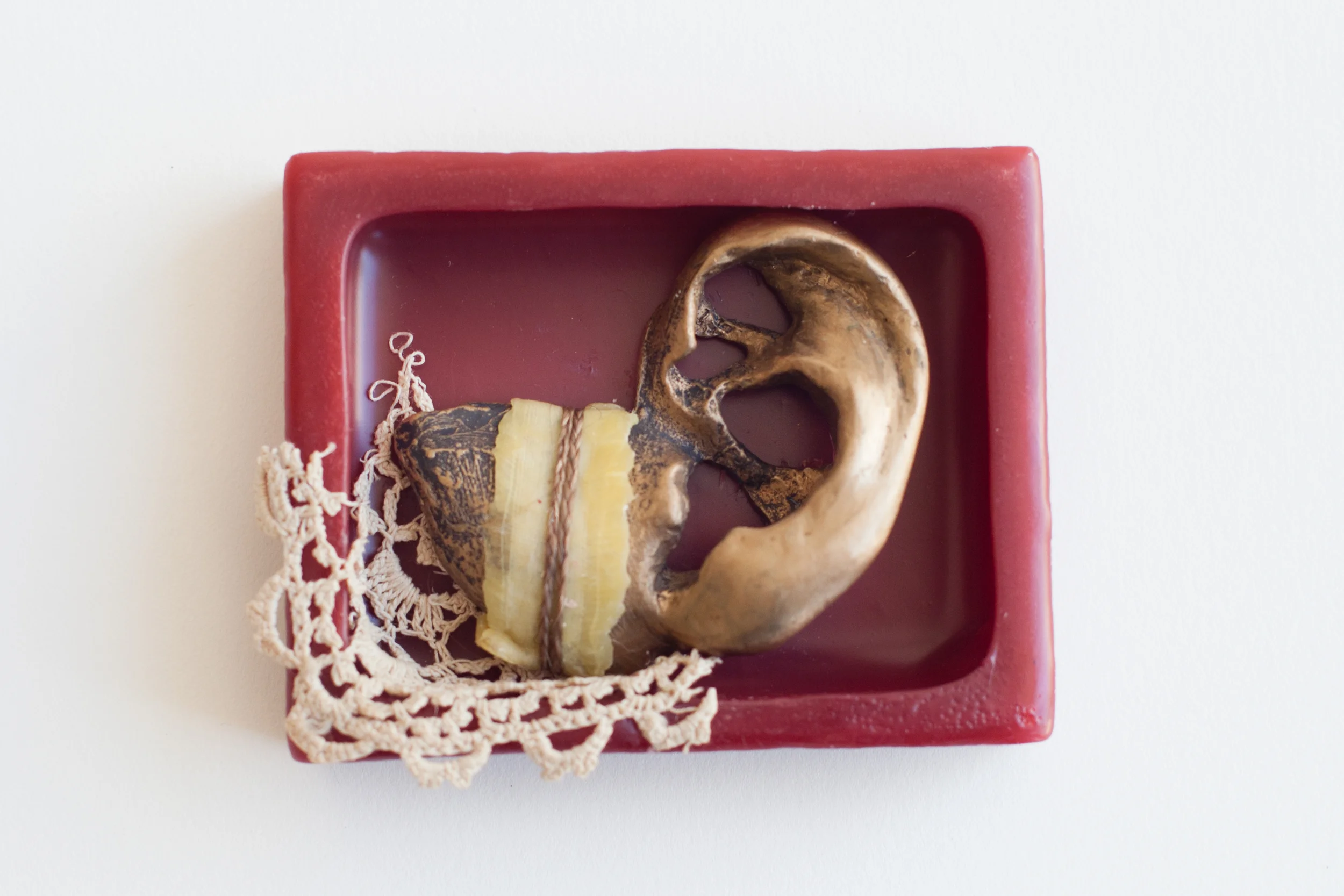 materials: cast bronze ear, antique lace, hair, waxed muslin, ink, cast wax box