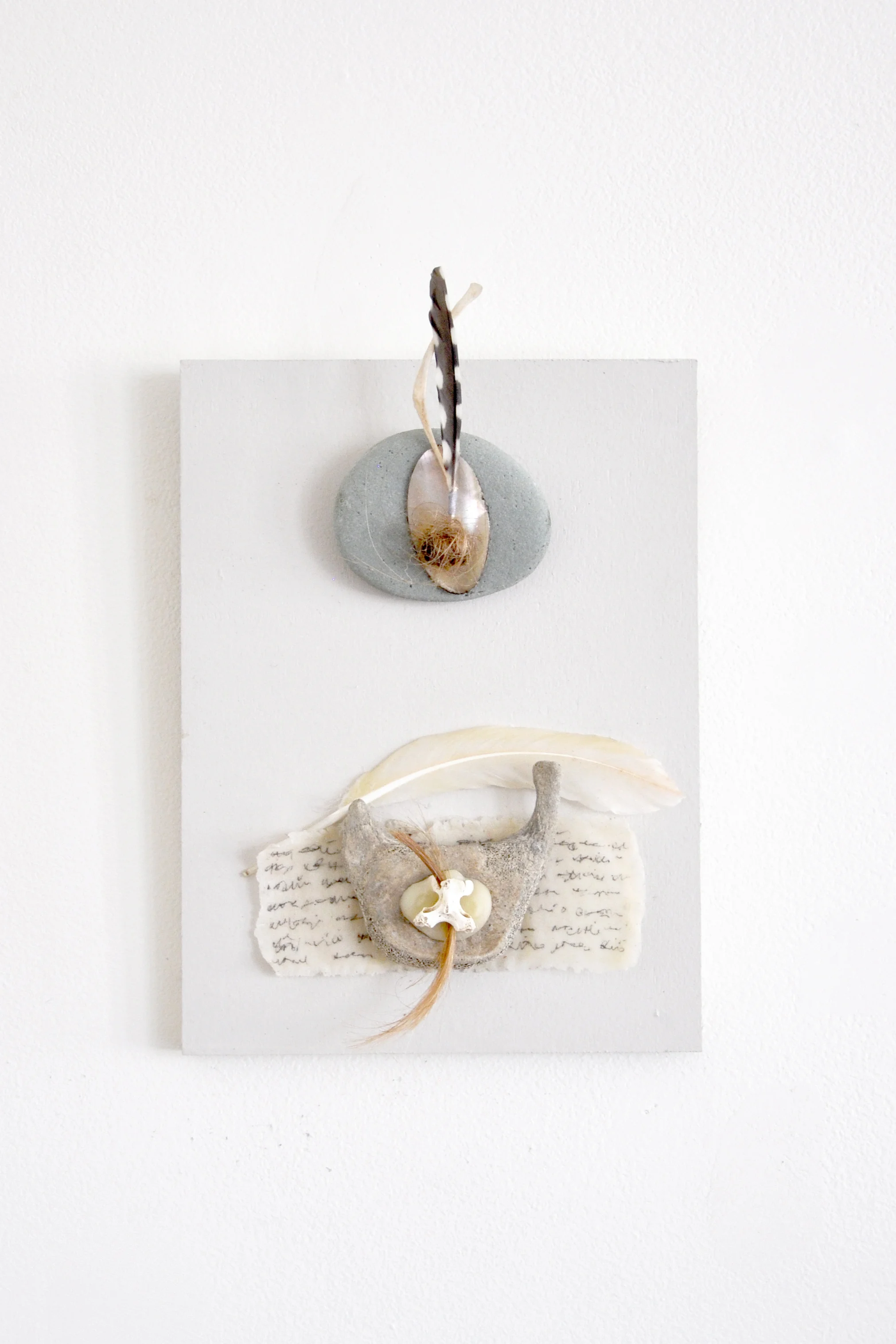 materials: bone, wax, hair, waxed muslin, ink, feathers, bronze, shell, stone