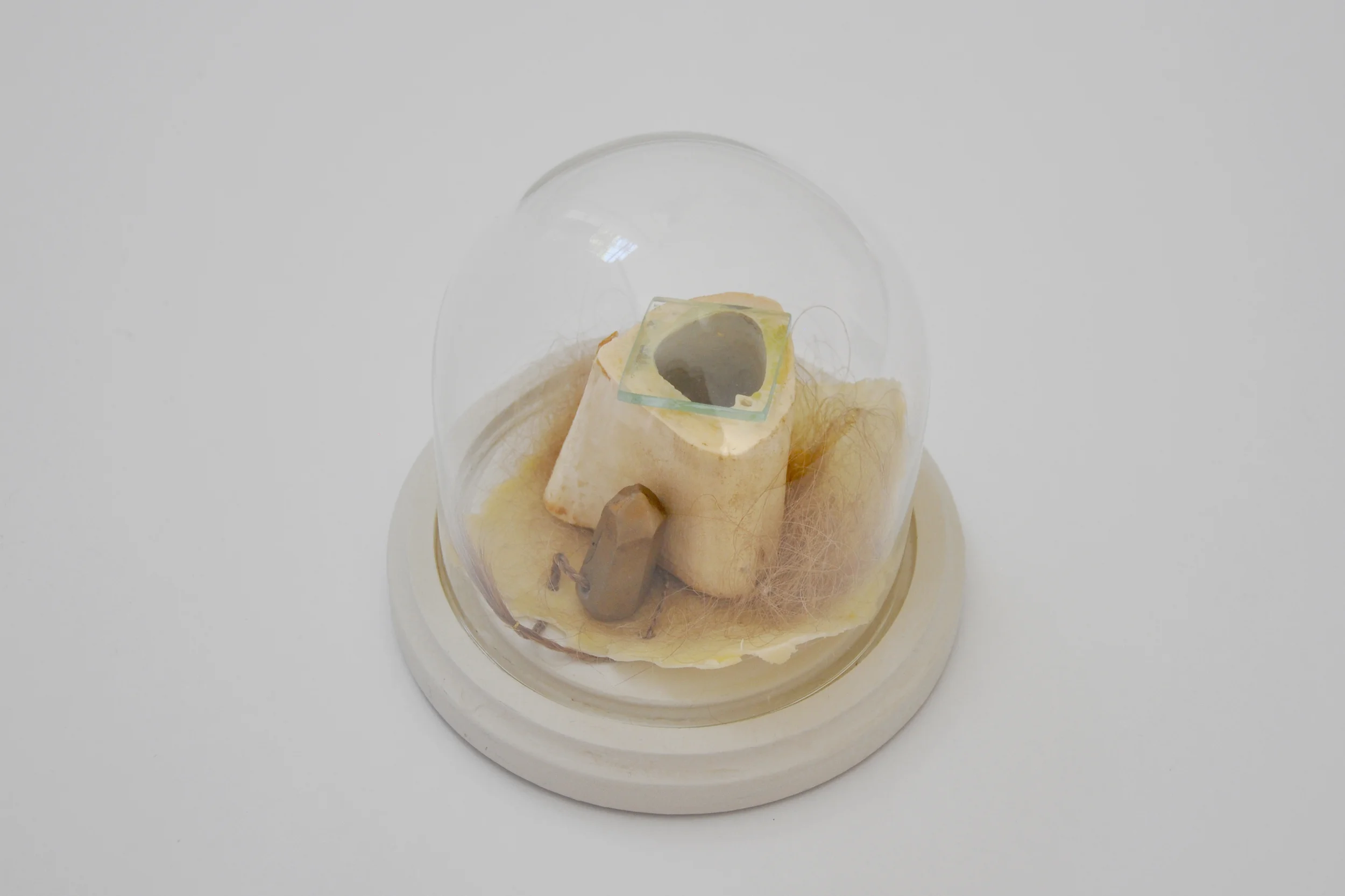 materials: bone, cast bronze crystal, waxed muslin, gold leaf, glass, hair